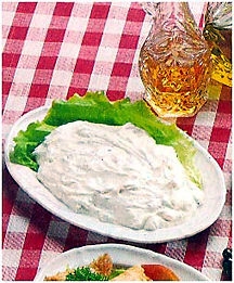 It's called tsatsiki or tzatziki (and pronounced tzah-ZEE-kee) and it is often the first contact many of us have with Greek cooking. This is the wonderful garlicky yoghurt sauce spread over souvlaki. But tsatsiki is more than a sauce. With a few thick slices of Greek bread and a glass of retsina or white wine, a dish of tsatsiki makes for a delicious summery lunch. Or, for a great combination, try it as a cold thick dip with thin slices of fried eggplant or zucchini. It also pairs so superbly with French fries that you may never ask for mayo or ketchup again.